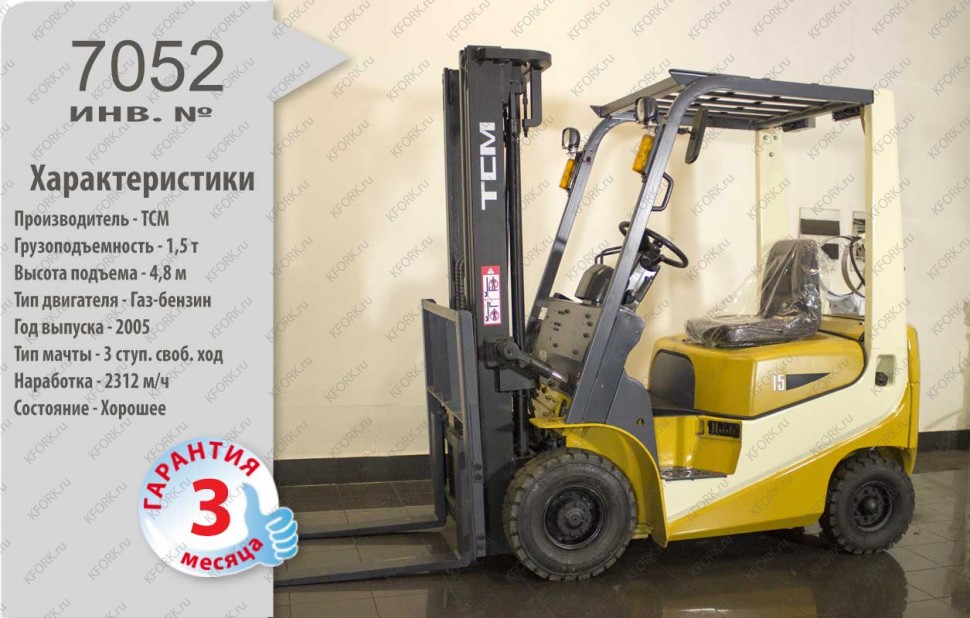 Газ-Бензиновый автопогрузчик TCM Б/У с интентарным номером 7052 2005 года выпуска. Состояние - Хорошее. Имеет грузоподъемность 1500 кг. Гарантия: 3 мес или 500 м/час.