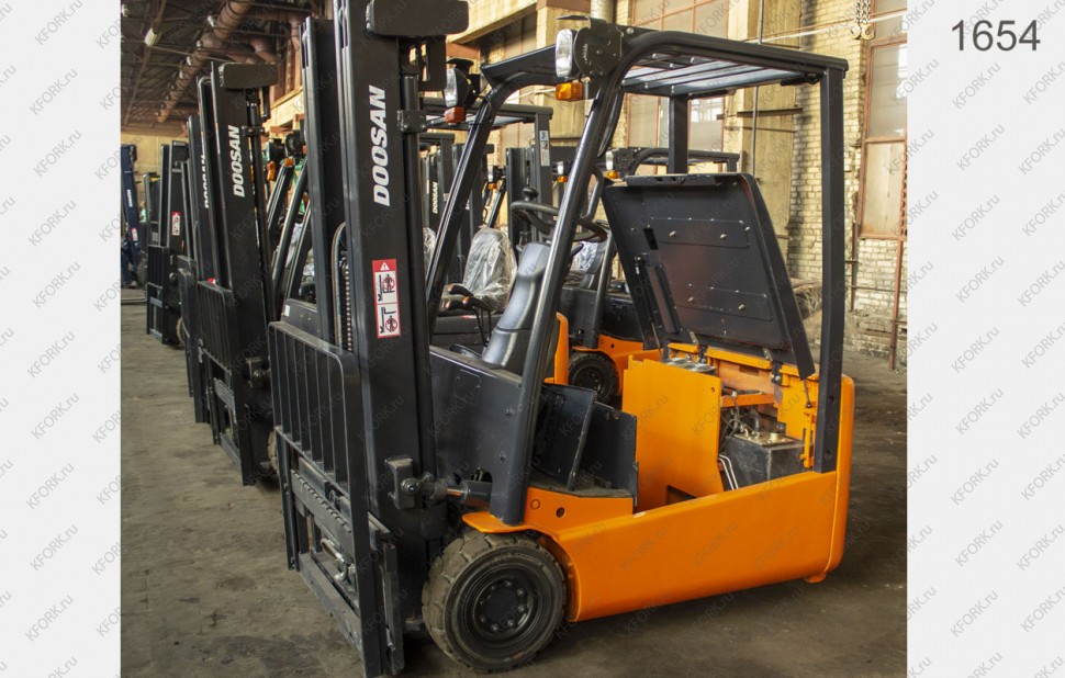 Электрический погрузчик Doosan Б/У с интентарным номером 1654 2012 года выпуска. Состояние - Хорошее. Имеет грузоподъемность 1500 кг. Гарантия: 1 мес или 200 м/час.
